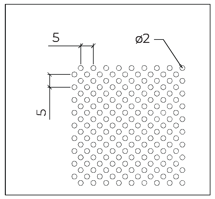 The holes diameter is 2mm and the perforated area covers 25%. Standard version panels can be supplied with an unperforated area of 10 mm (full perforated). Panels are also available with unperforated area of 100 mm (400 X 400 mm perforated area).